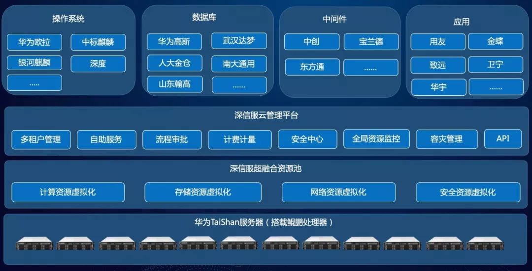 华为TaiShan服务器是基于华为鲲鹏处理器的新一代数据中心服务器,依托华为TaiShan服务器,深信服超融合管理平台可实现资源的统一管理和运维,大幅提升用户在运维管理上的工作效率,帮助用户在新架构的服务器中实现云化管理,降低新架构服务器引进带来的管理负担。