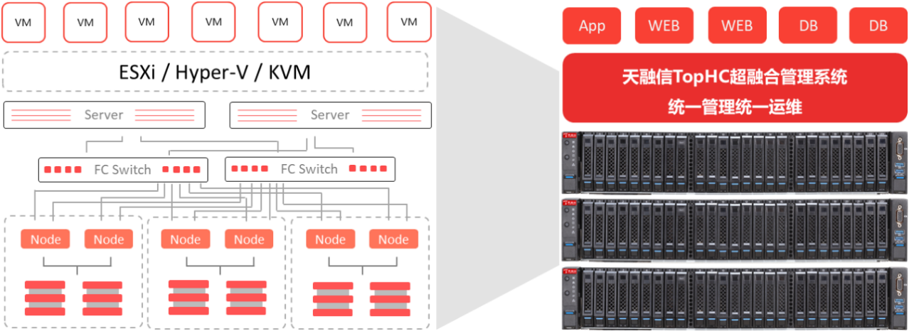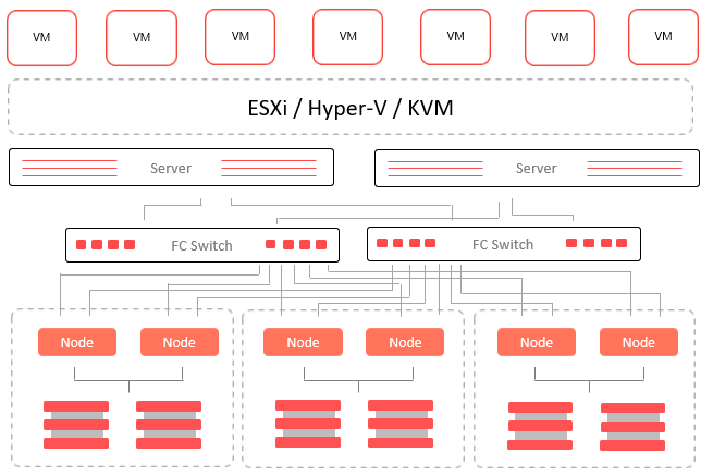 在虚拟化数据中心环境中,计算集群的存储服务靠FC-SAN/IP-SAN提供,造成了两个方面的制约: