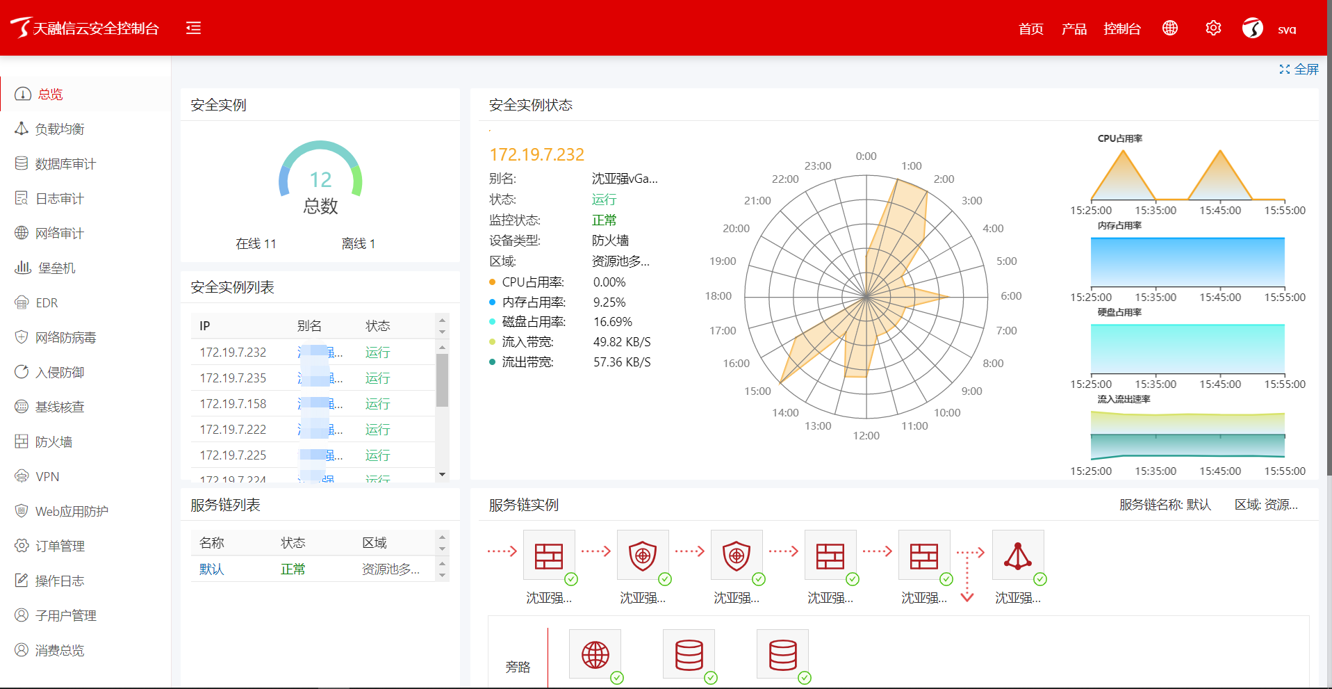 统一管控通过单个账号可以实现所有安全的网元的单点登录,生命周期管理安全组件的资源状态进行统一运维监控