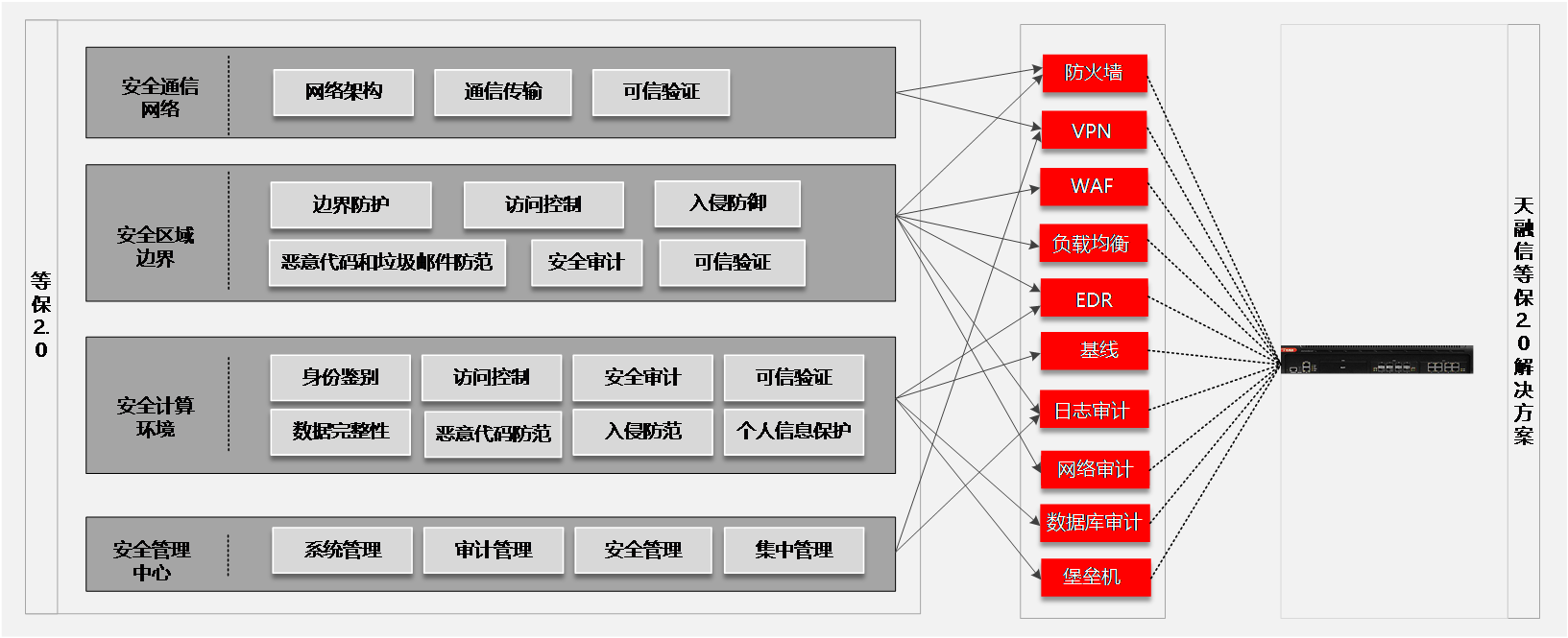 天融信等保一体机基于等级保护二级、三级要求推出对应的安全服务一体化套餐,用户无需单独另购其他安全资源,满足云环境下各种安全防护需求,包括网络安全,主机安全,应用安全,数据安全等。