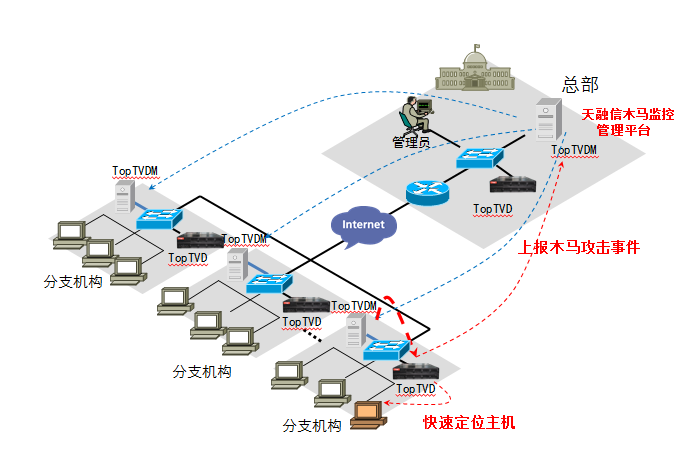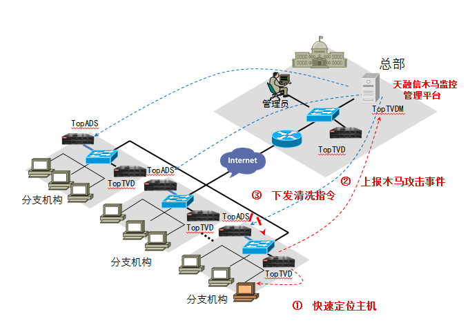 对用户安全威胁最大的是DOS和DDOS引发的流量造成带宽浪费和运营质量下降,天融信僵木蠕监测系统可在企业特定敏感区域,以旁路接入的方式实现对所有网络流量的监测,并与天融信僵木蠕集中管理平台和部署在出口的TopADS形成策略联动。