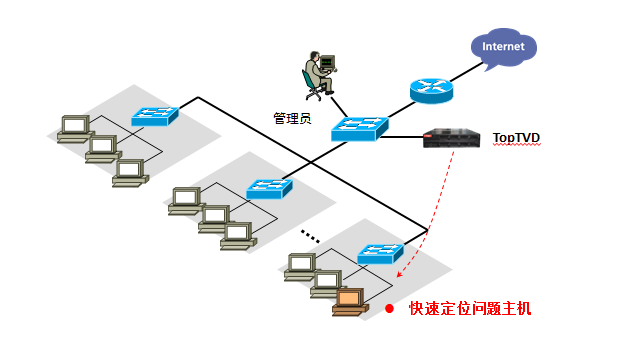 对于普通用户网络,由于规模比较小,网络结构简单,设备可采用旁路部署的模式,当设备检测到僵木蠕攻击后,可通过旁路阻断的方式进行攻击阻断,整个部署环境如下图所示: