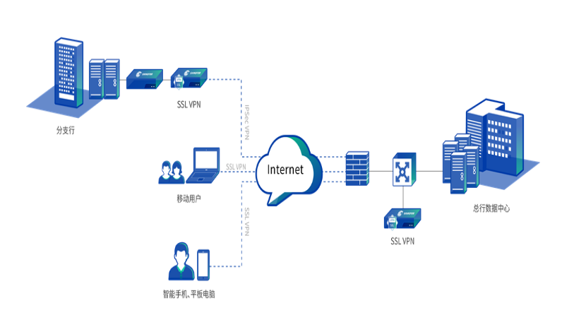 在总行部署深信服移动办公安全平台,移动办公人员可以随时随地借助智能终端通过浏览器接入总行内网,深信服移动办公平台的五大安全体系保证了整个端到端接入过程的安全性。