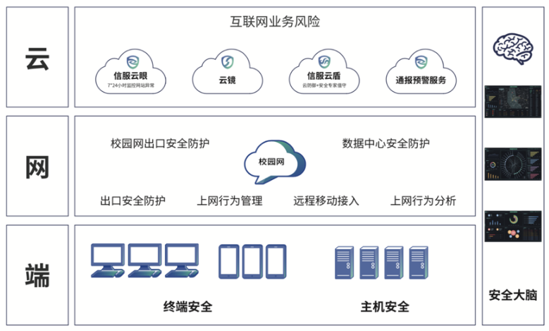 基于智慧校园建设中合规性要求和校园网内业务驱动要求,学校迫切需要建立一套简单有效的安全建设体系,深信服提出以安全可视化管理中心为核心,构建“云、界、端”安全立体防护体系,提高学校“主动防御”、“持续检测”、“快速响应”的能力,重点对校园网的互联网接入区、数据中心业务区(包括服务器+存储的传统架构及云数据中心架构)、终端区进行全方位的可视化立体防护。