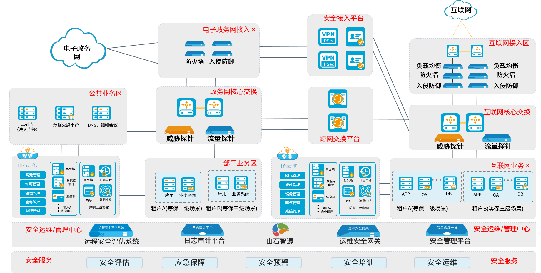 山石网科从用户目前的网络安全现状出发,结合业务和安全需求,设计符合用户自身安全需求、符合网络安全等级保护、国家电子政务外网标准等要求的安全解决方案。