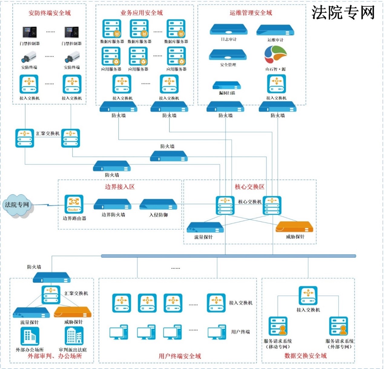 通过强化对法院专网的业务应用、运维管理等内部关键区域边界的安全防护,提供访问控制、入侵防御、病毒过滤 、未知威胁防护、威胁关联分析、策略联动等核心安全能力。通过多种智能分析引擎,及时发现边界内外的攻击行为;通过安全可视化,实现风险到威胁全面可视化;通过安全策略联动功能,提供实时攻击防御,减少法院专网关键区域遭受攻击的风险。